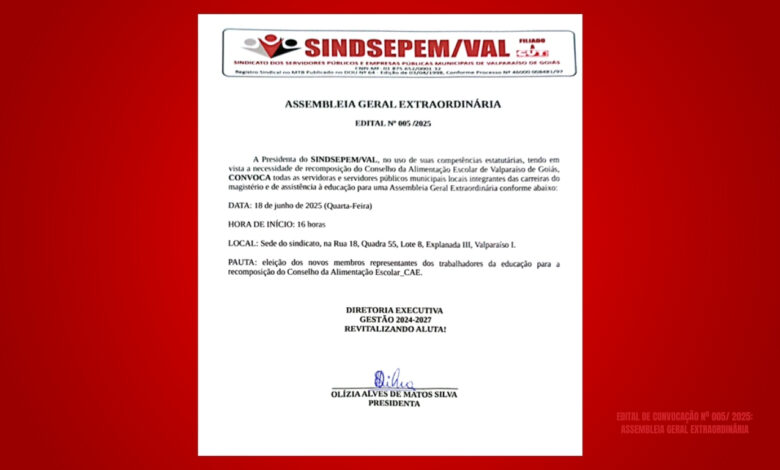 A Presidenta do SINDSEPEM/VAL, no uso de suas competências estatutárias, tendo em vista a necessidade de recomposição do Conselho da Alimentação Escolar de Valparaíso de Goiás, CONVOCA todas as servidoras e servidores públicos municipais locais integrantes das carreiras do magistério e de assistência à educação para uma Assembleia Geral Extraordinária conforme abaixo: