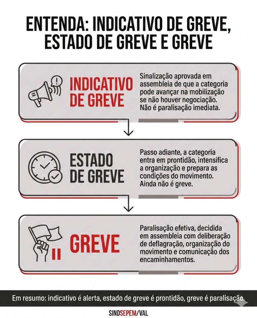 Além da pressão institucional no Executivo, o SINDSEPEM/VAL informou que vai intensificar a mobilização da base para fortalecer o movimento. Isso inclui: