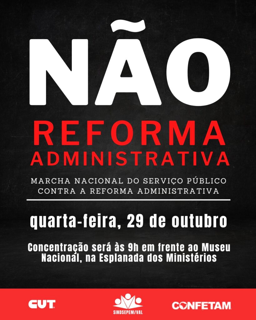 A concentração será às 9h em frente ao Museu Nacional, na Esplanada dos Ministérios. O ato é organizado por centrais sindicais, federações, sindicatos e movimentos sociais de todo o país, em resposta à proposta de Reforma Administrativa que tramita no Congresso Nacional e ameaça direitos históricos do funcionalismo público.
