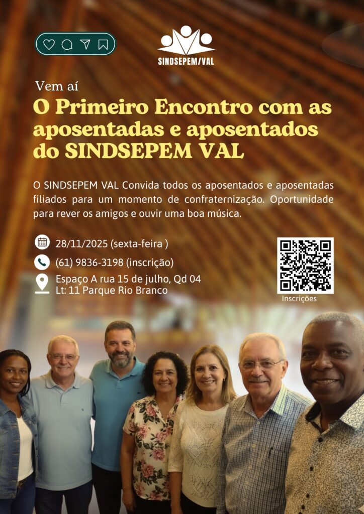 O SINDSEPEM VAL prepara um momento especial para quem dedicou anos de trabalho ao serviço público municipal. No dia 28 de novembro, a partir das 12h, aposentadas e aposentados filiados ao sindicato terão a oportunidade de participar do Primeiro Encontro, que será realizado no Espaço A, na rua 15 de Julho, Qd 04, Lt 11, no Parque Rio Branco.